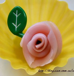 用削皮刀刮下薄薄的糕片,从头折叠卷起既成。(蓝色的花用了少许色素)