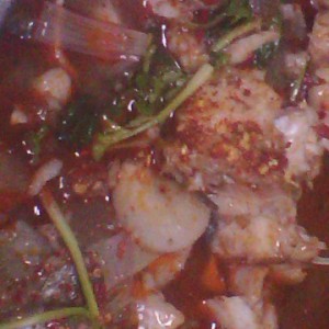 盛入放了配菜的盆中,撒上干辣椒末。香菜,锅中油烧热,浇在干辣椒末上,水煮鱼出锅啦。