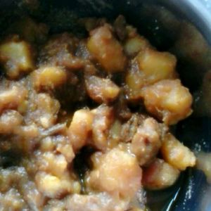 等锅里汤快干再加水土豆,在小火炖会,土豆熟就可以出锅了。这时汤很少呈粘稠状。可以根据自己口味加入香菜。