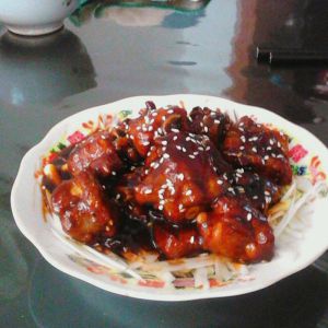 盆上先放上大葱丝,再放上排骨出锅散上白芝麻,大功高成 。