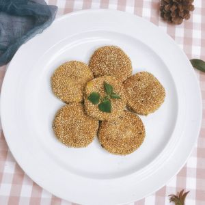 芝麻放入盘中,将胚饼在芝麻中上下按压,让饼沾满芝麻。