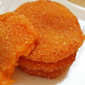 将拌好的南瓜泥制成丸子然后拍扁,粘上面包糠;