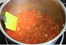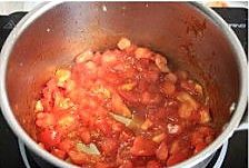 倒入番茄丁,同炒一分钟,倒入一碗水,烧开后转小火煮至汤汁剩一半,加入炒过的肉末