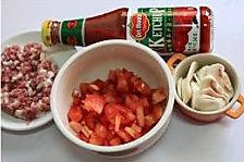备好材料,番茄切丁,2肥8瘦猪肉切碎,然后用少许胡椒碎、盐、淀粉腌制一会(不喜欢带肥的可以换成全瘦肉或者牛肉)
