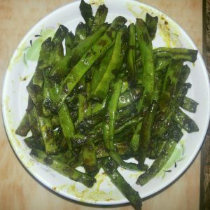 热锅烧油,加蒜蓉小火炒香变黄,倒入四季豆煸炒至外皮变色,加些许盐和咖喱粉继续炒两分钟,关火装盘