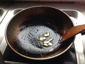 锅中放油,烧热放入蒜爆香。