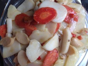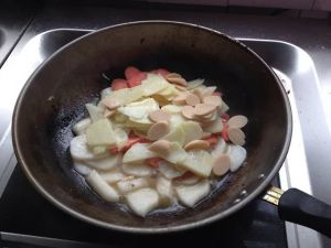 放入鸡肉肠,胡萝卜,土豆片