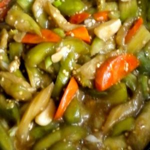 开火,放油,放葱蒜,胡萝卜,翻炒,茄子下锅翻炒一分钟左右,先放料汁搅匀,在倒入淀粉汁!搅匀,小火收汁,撒上蒜沫!出锅!