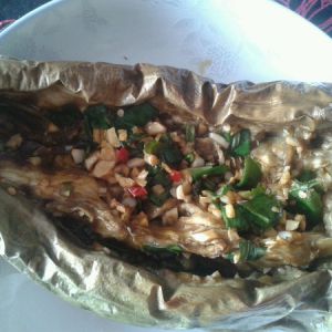 茄子烤好拿出来,用刀割开一个长条行口,不要割断!把调好的料放进入,再放入烤箱烤5分钟,出来就可以吃了!