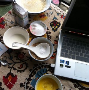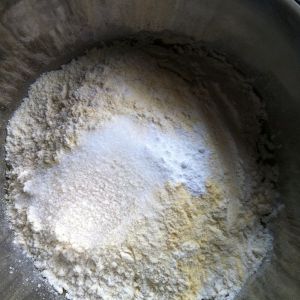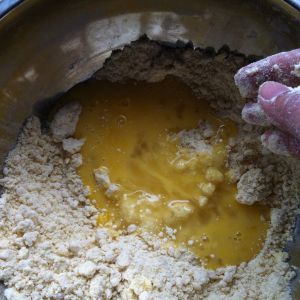 把低粉和泡打粉盐糖放在,融化过的黄油里面,加入细糖!用手搓成颗粒装