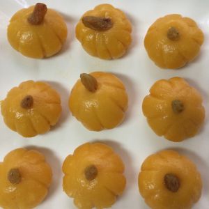 4取小块面团搓圆并轻压扁,然后用勺子划上线条,顶部用葡萄干作瓜蒂.