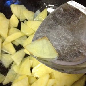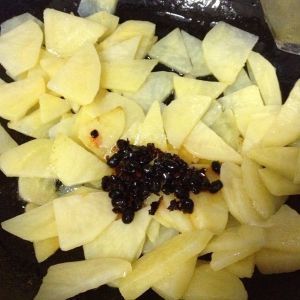锅里热油,放入土豆炒一炒,中小火。两面微黄微焦就行