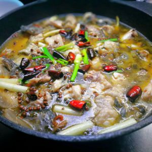 另起个锅烧油,把青花椒和干辣椒段下锅炝出香味,再淋在酸菜鱼上。