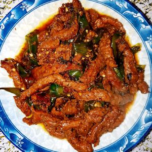 3.锅中烧油,油热放入辣椒炒,(加洋葱)来回翻炒,放入牛柳!来回翻炒,甜咸可以适当加!