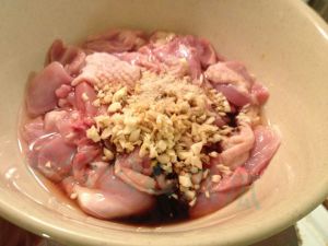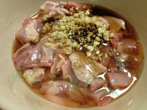 腌鸡腿肉:洗净的鸡腿肉加入生抽、老抽、料酒、鸡精、胡椒粉、蒜茸、麻油、糖适量,腌上8到10分钟。