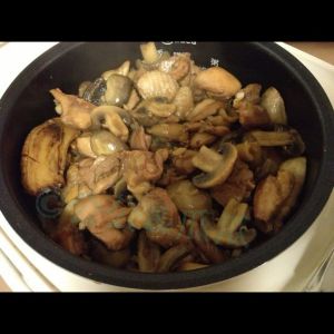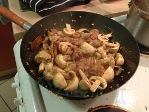 油热后,放剩余蒜瓣以及姜片入锅小火微煸,后把鸡腿肉连汁倒入炒锅,调味料除老抽以外开个人口味酌量补入,后大火炒5分钟,放入蘑菇翻炒数下。