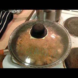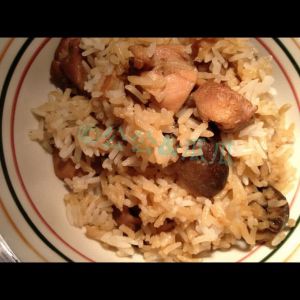 此时趁米饭尚未煮好时,把肉倒入电饭锅中,汁也可酌量倒入,继续焖煮。