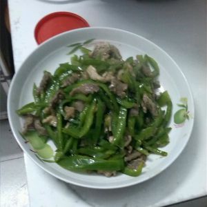 另起一锅 热油 爆香葱 姜 八角 放入切好的青椒丝 翻炒 放盐 (盐只要够青椒的就好 肉里面已经有盐了不要多放)