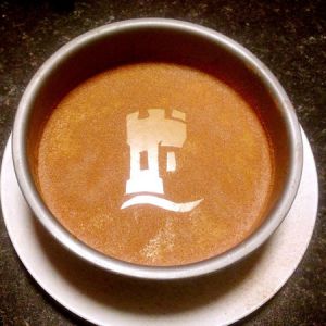 有兴趣的话,可以利用可可粉画一个图案。方法是:用锡纸剪出一个形状,然后用镊子铺在蛋糕上,贴好。再筛上一层可可粉。确认可可粉粘牢后,用镊子把锡纸撕下,大功告成!(其实可以不用锡纸,随便什么纸,干净就好。)