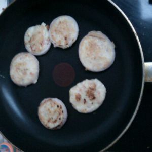 随后用勺子舀一勺土豆糊,放入洋葱圈内,用小火煎至定型,翻转另外一面至两面都金黄就可以了