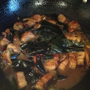 汤汁炖下一少半时放海带。盖上盖子,中火炖,汤汁快没有的时候大火收汁。观火出锅。完成!