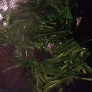 竹笋翻炒一阵子后用一个干净的碟子先盛出来,再放油单独翻炒一下韭菜,放少许盐。