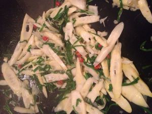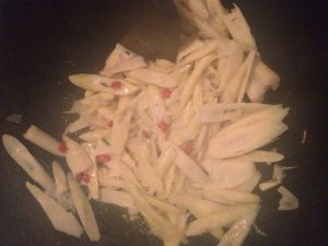辣椒和蒜蓉的味道出来后,把切好的竹笋倒进去,别忘记放盐,一阵爆炒。