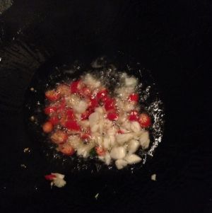 先热好锅,再放油,等油也热得差不多了就把准备好的辣椒和蒜蓉放下油锅爆出味道。