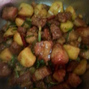 压好的五花肉放入锅里和土豆炒。加入盐,味精,酱油、辣椒。就可以起锅了。(因为土豆不够烂,只能和五花肉一起煮了