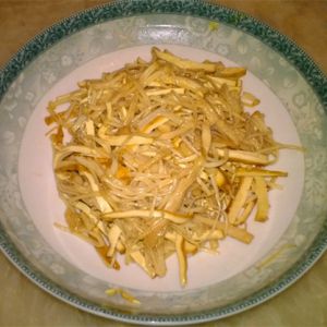 将香干和金针菇一起倒入大碗,加盐、鸡精、麻油拌匀即可。