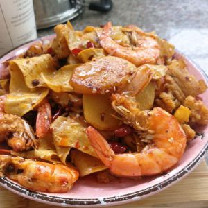 放入蔬菜翻炒均匀,再放入虾和五花肉继续翻炒,虾颜色变红后再炒3分钟左右,撒上芝麻翻炒一下即可出锅(出锅后可撒上香菜和红辣椒段再装饰一下)