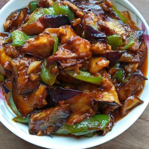 圆茄子洗净切块,蒜瓣拍碎,稍切一下,青椒切块。在茄子里放入适量玉米淀粉搅拌均匀,腌制十分钟