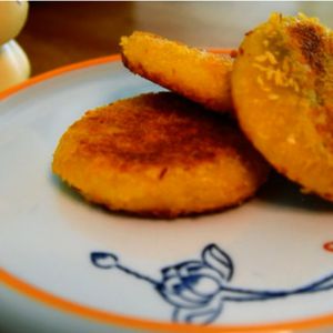 将南瓜面团分成7份,揉成圆形,按压成饼状放入红豆泥