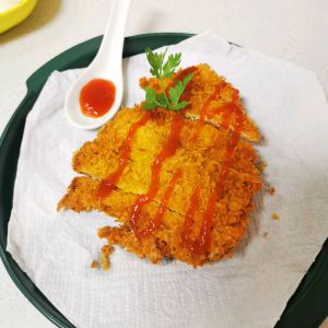 鸡肉先裹淀粉,再裹鸡蛋,裹面包糠