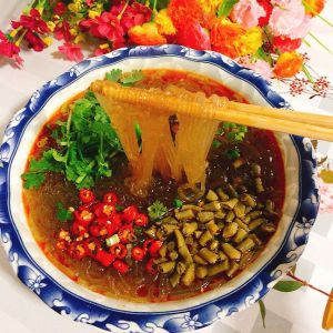 放入老干妈豆豉,香菜,小米辣,酸豇豆,撒上适量的葱花,搅拌均匀即可食用!