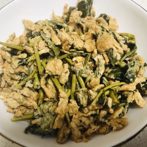把鸡蛋液倒入香椿里,搅拌均匀。