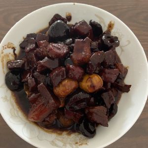 出锅装盘,美味的香菇板栗红烧肉就做好了,儿子说吃的好满足,吃了两大碗饭