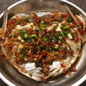 鱼头腌制完成后,清洗一下,再用厨房纸吸去多余水分,倒入调料汁,大火蒸十分钟就可以了