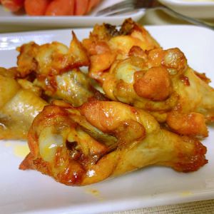 烤盘里垫一层锡纸,刷一层油,摆上鸡翅根上下火200度烤35分钟,中途我再刷了两次油两次蜂蜜,还有翻动两次