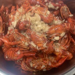 加入蒜蓉小龙虾调料,翻炒至出蒜香味