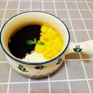 从冰箱取出双皮奶,放入准备好的奥利奥,注意先放奥利奥,不然撒在芒果表面上,影响美观,后再放入芒果丁,放一个薄荷芽装饰,大功告成!