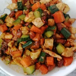 放入切好的葱,胡萝卜丁,黄瓜丁,翻炒一会,然后放入炒好的鸡胸肉,加些许盐,同时加一点白糖提鲜,还可以中和豆瓣酱的辣味,翻炒均匀。