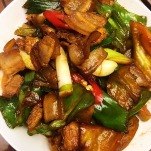 锅中放入一点食用油,将五花肉倒入翻炒出油(喜欢什么程度的肉就炸到什么程度,依个人口味调整),加入盐巴,生抽,蚝油,白糖,料酒翻炒,炸出的油倒出