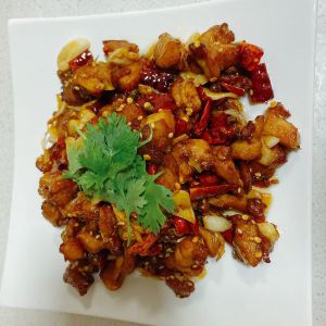 锅里放底油,放麻椒,麻椒要多放一点,把葱姜蒜辣椒段炒香,就可以倒了炸好的鸡丁了