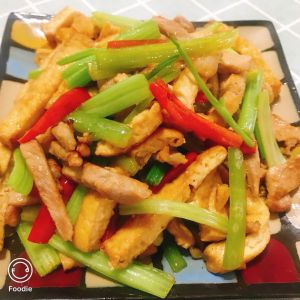 热锅下油,放入蒜米爆香,下入肉,炒断生,放入生抽搅拌均匀,然后再放入豆腐,翻炒入味,最后放入芹菜,辣椒翻炒断生,放入盐,蚝油,一点点糖搅拌均匀出锅。