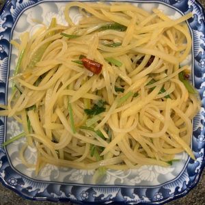 将土豆丝切好淘几遍,把淀粉淘出洗净