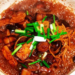 肉炒出油后放入豆腐香菇加水煮。放盐、鸡精,中火煮大约10分钟后加入少量水定粉。在煮7分钟后改大火收汁。