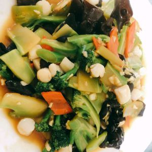 加入木耳,西蓝花,贝丁,加入蚝油,生抽,盐,蒜末,水淀粉勾芡。加入鸡精。