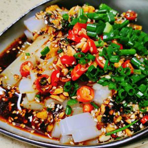 佐料准备:大蒜剁成泥,两勺酱油,两勺醋,一勺香油,一勺花椒油,一小勺白糖,少许鸡精,少许辣椒面,一勺半的辣椒油(自己秘制的)切几颗小米辣