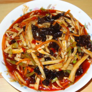 下胡萝卜丝在下杏鲍菇丝略煸,,青椒丝,黑木耳煸炒几下,将兑好的碗汁倒入锅中,大火快速翻炒,芡汁裹到菜上即可。